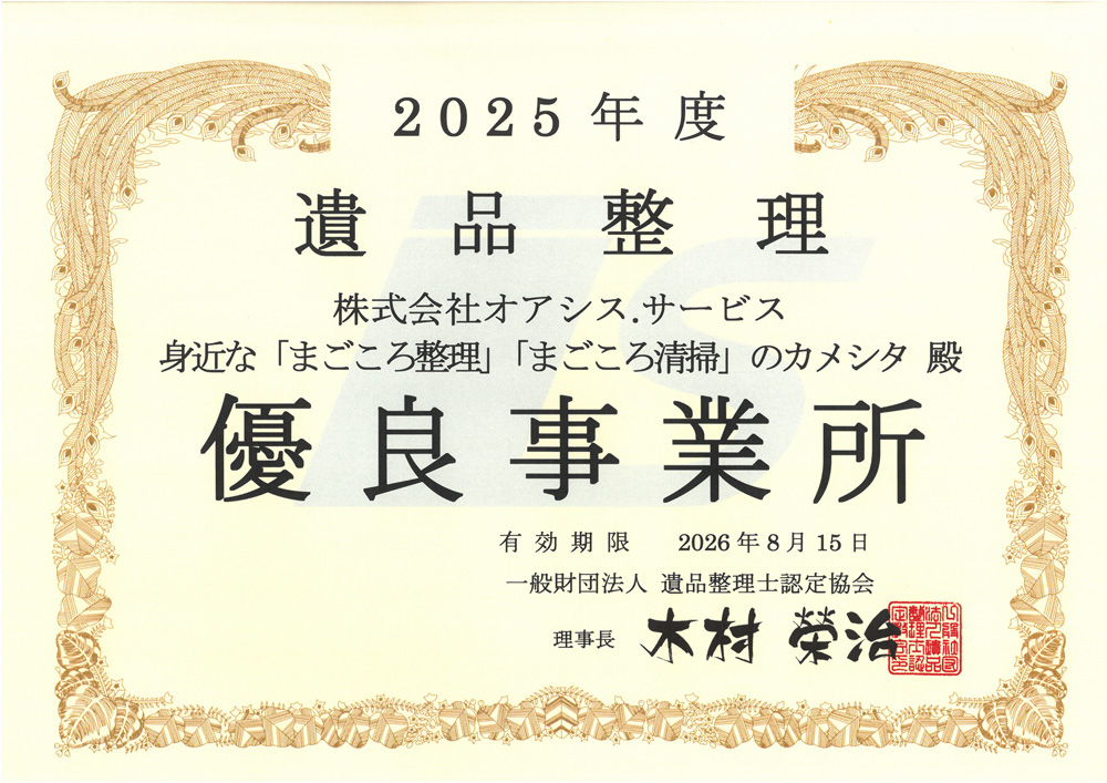 当店は、一般社団法人遺品整理士認定協会から「優良事業所」としての認定を受けて活動しています。常に協会との連携により適切なご提案やご依頼をお受けできる体制が整っています。